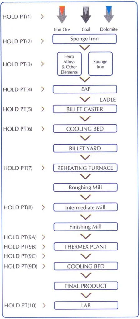 Rolling Mill: The Billets are then taken for production in the Rolling Mill. During the production process, inspection is done at various stages. The non-conforming products are identified and segregated properly for recycling. The finished product is then subjected to final inspection (visual inspection & physical property) and a Lot Number is allotted to it before being stored in the finished product yard.